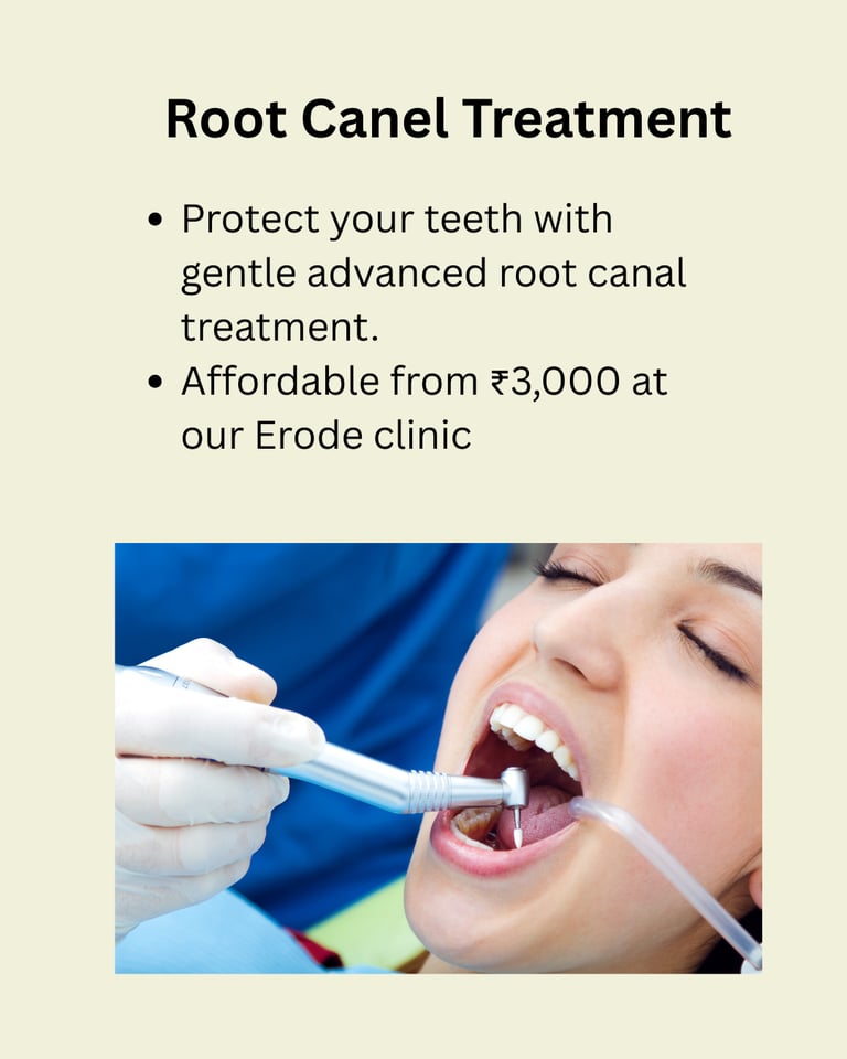 With over 15 years of excellence, we specialize in dental implants, root canal treatment (RCT), braces, clear aligners, and cosmetic dentistry in Erode. Our clinic in Veerapanchatram, Erode is committed to affordable, painless, and advanced treatments.